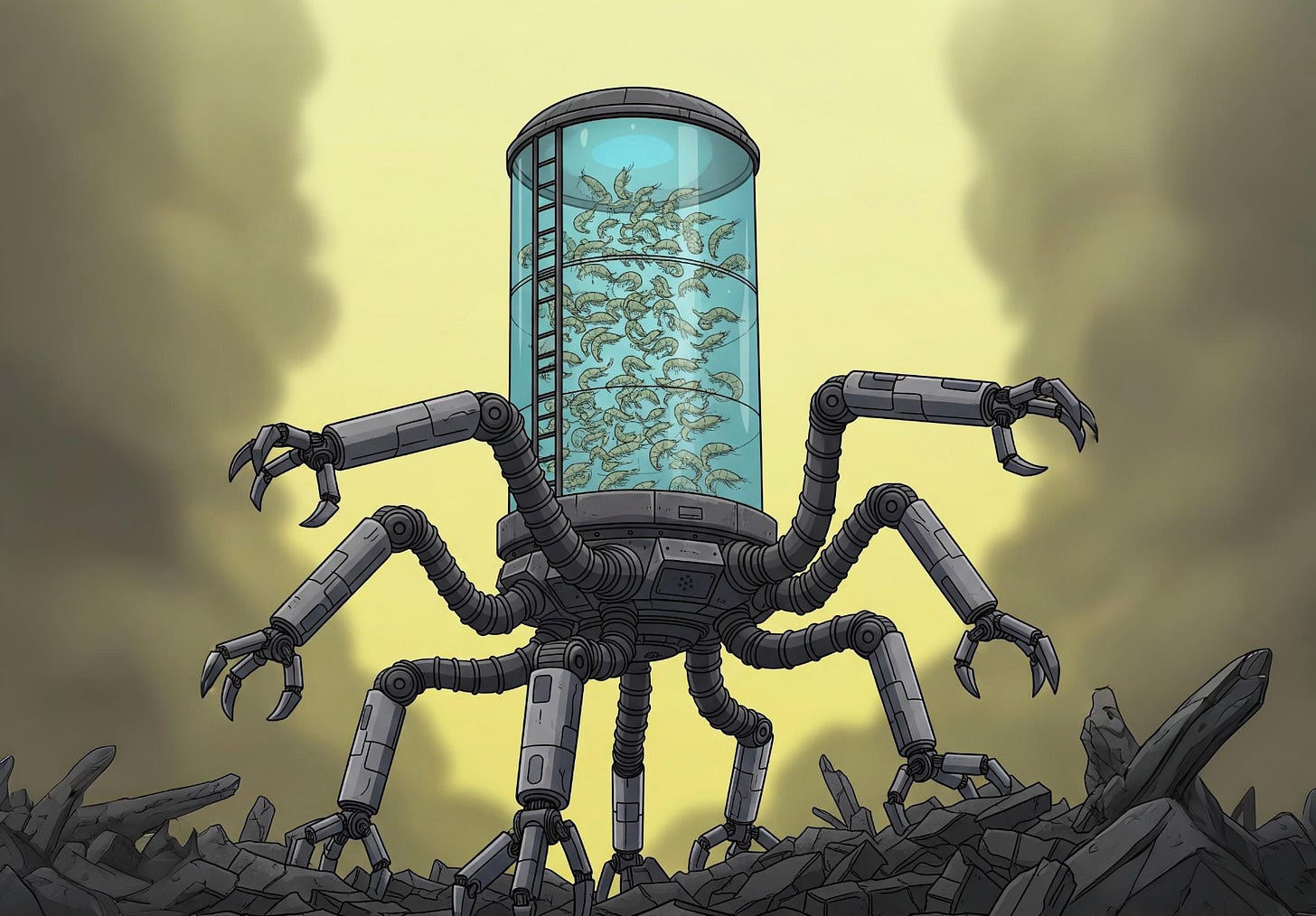 NOT. SO. FAST. As you hear the much buzzier robotic voice appearing over one of the ruins, your heart sinks. A robot mechsuit with 8 arms slinking over a pile of rubble, attached to a giant tank, with 10,000 shrimp contained inside.