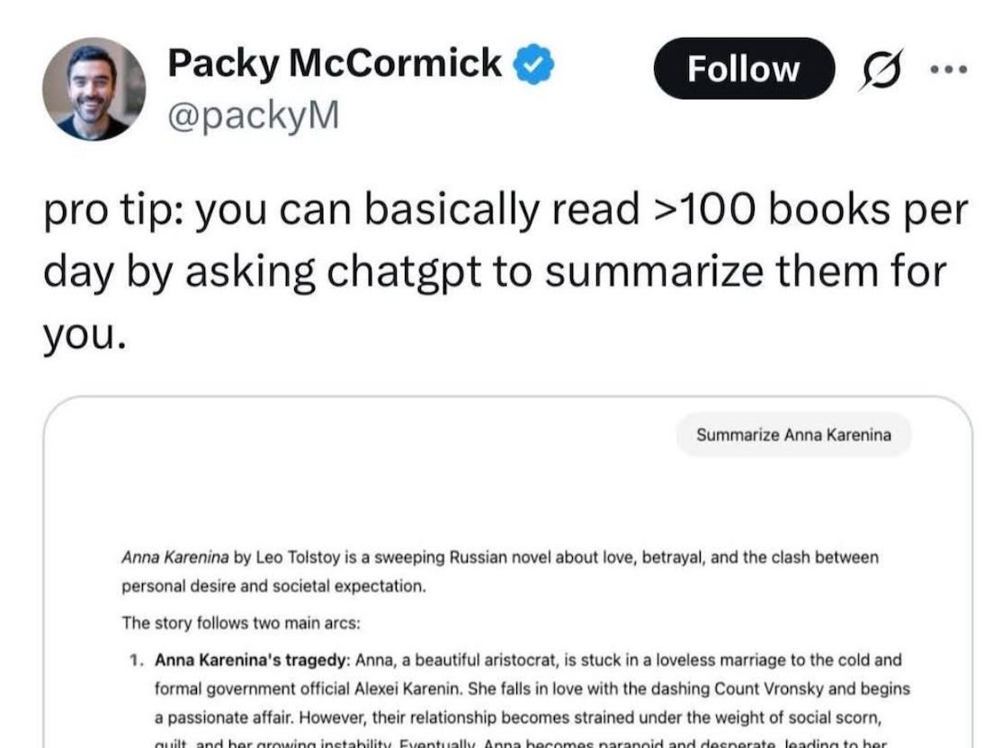 reposted on substack disapprovingly. I mean, it only has around 2k likes, which isn’t a ton (and it’s satire), but it sparked discourse in me so I’m going to talk about it.And right off the bat, before I get into the meat of the issue, I’m going to point out I think there is one valuable way you can read 100 books per day off of AI: if those books are educational.