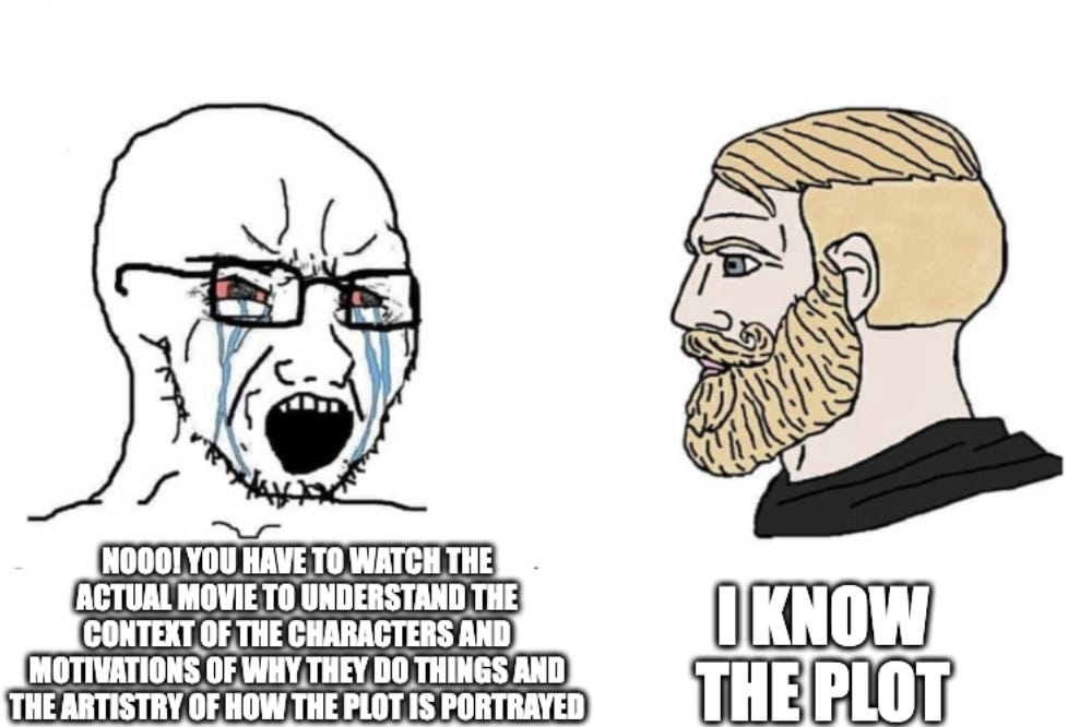 I have another one of my closest friends who will join the debate, indignant at my friend, and say “The Wikipedia summary is lifeless, you have to read the Reddit synopsis to understand the emotions behind the people who see the movie.”