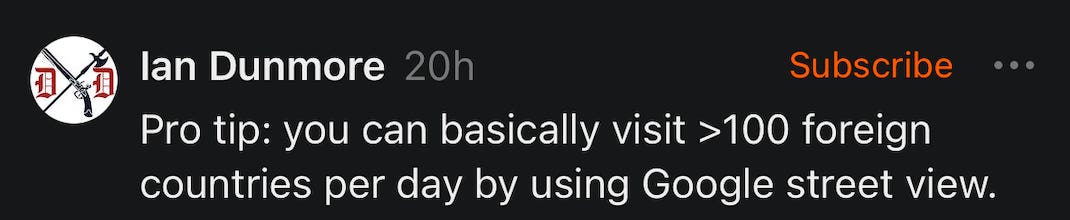 Re: visiting 100 foreign countries using Google Street View - you do get some of the benefit of travel with something like that (and reading about other people’s travels, watching their travel vlogs, etc.), but there’s still an effable experience of actually physically being in a place and living amongst its people that cannot be replicated through mere distant observation. I’m reminded of the Mary’s Room philosophical thought experiment - you can learn as much as you want about the science of color, but none of it will let you know what it feels like to actually see color.