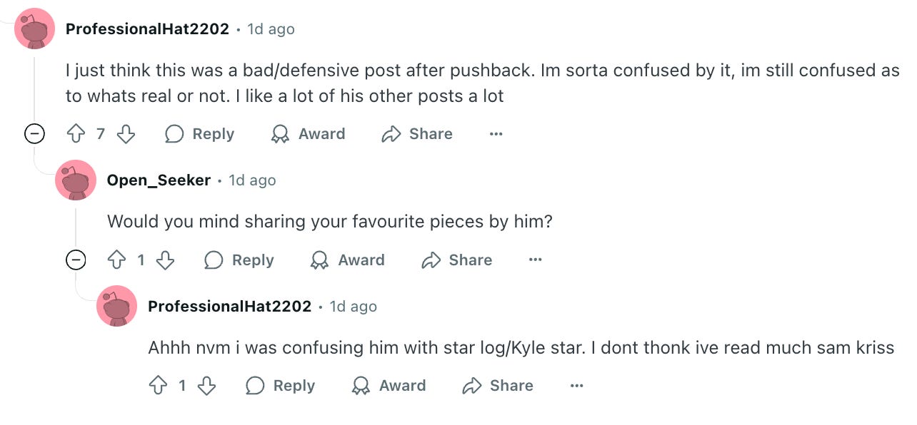 Sam Kriss than shot back with a 6,000 word essay called Against Truth where he fires shots at people calling him a liar, Yudkowsky, AI bros, and utilitarians. I encourage you to read it so you can decide if my criticisms are fair, but here’s a summary:
