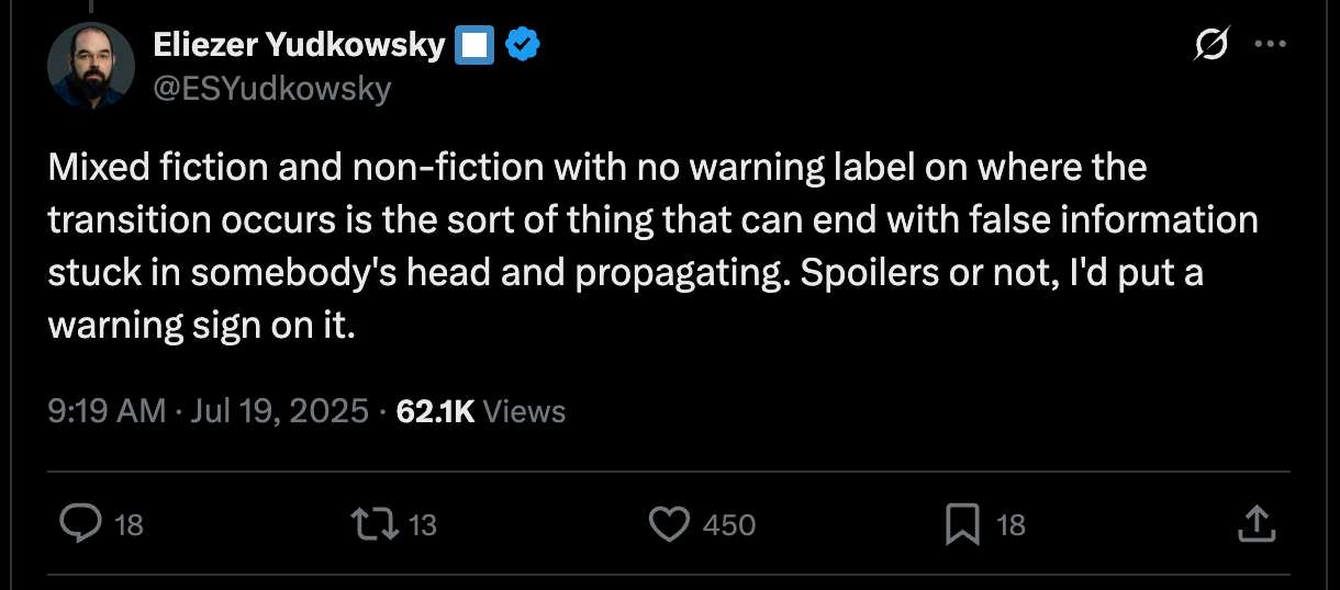 made a post titled The law that can be named is not the true law about how modern anti-terror laws criminalize not just an action but even questioning the law itself. It starts by talking about the UK’s new Palestine Action law, which, because of UK law, makes it illegal to even express an opinion that might make other people support Palestine Action. He then weaves through similar and related cases involving Judaism, and ends with a case about Laurentius Clung, a nihilistic Calvinist who insists all souls are damned.People noticed that this “Laurentius Clung,” did not exist, and was in fact made up to make the story cooler. Rationalists, like Eliezer Yudkowsky, shot back saying mixing something that appears as political commentary along with fiction might make people believe the lie that you put immediately after the facts.