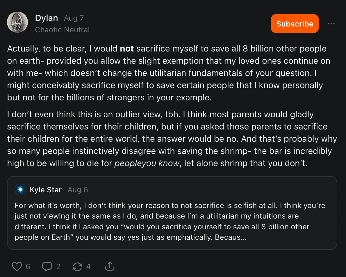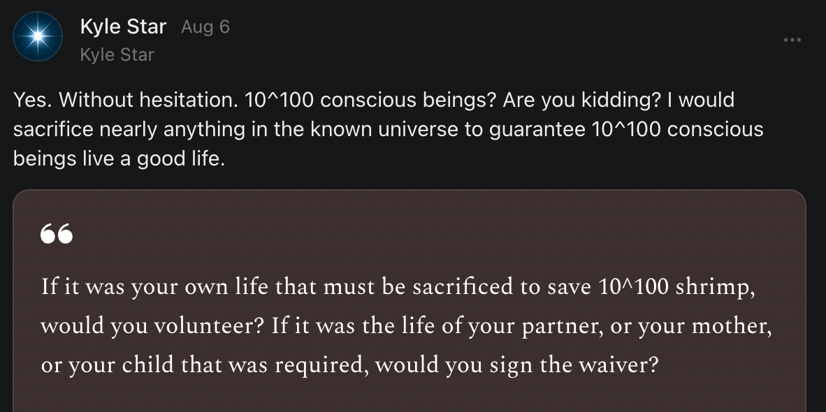 So what’s the deal with the doubt? I think the resistance here is a resistance bourne out of disbelief — “surely you don’t actually care about what a bunch of shrimp lives are like? Surely this is a performance?”