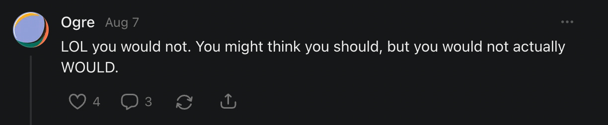 But isn’t all of this stupid? At the core of this is the idea that to think something is moral, you have to be willing to do it. Which I believe is totally missing the point. Let me illustrate this with Dylan’s3 other point in the article.